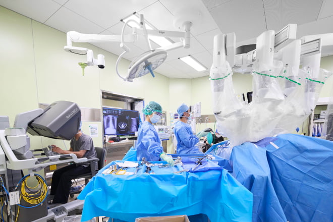 経験豊かな12名の専門研修指導医が指導します。胃癌、大腸癌などの悪性疾患の腹腔鏡やロボット支援手術のほか、胆のう炎や鼠径ヘルニアなど良性疾患手術を数多く経験できます。